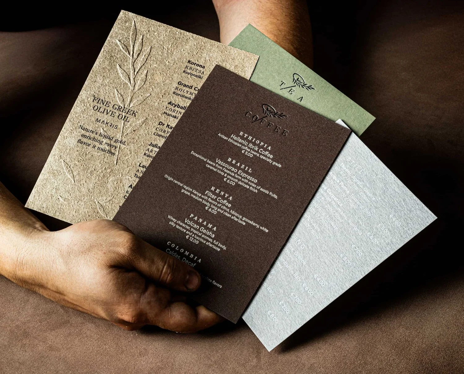 Εξερεύνησε τη συλλογή premium χαρτιών μας για να βρεις το ιδανικό χαρτί για το γούστο σου. Επίλεξε ανάμεσα σε ματ, μεταλλικές και με υφή επιλογές, καθώς και σε φιλικές προς το περιβάλλον επιλογές για να απογειώσεις το μενού σου.